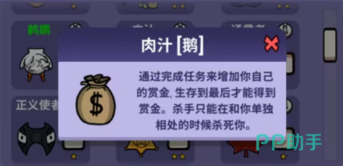 肉汁作为入门首选角色,无主动技能,依赖任务进度积累赏金,最终存活方可获得胜利奖励。其身份标识在鸭子阵营视角下完全可见,胸前图示无法隐藏,因此无需伪装。推荐开局即汇入多人队伍行动——因鸭子仅能在单人状态下发动击杀,集体行动可显著降低遇袭概率,属于低门槛高容错的稳健选择。