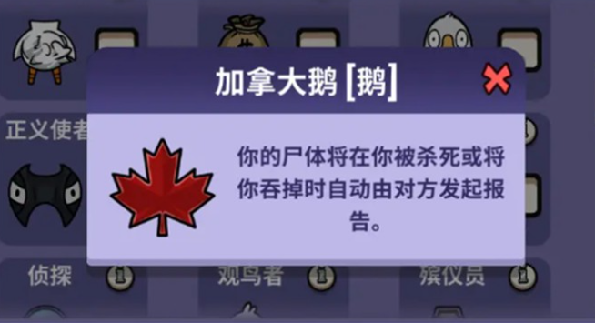 加拿大鹅具备被动触发会议机制:无论被击杀或被吞食,均会强制开启紧急会议。实战中可采取“诱杀策略”,提前向可信队友密语告知身份,诱导鸭子主动发起攻击。一旦触发会议,凶手将被迫参与讨论,大幅提高其暴露概率,属于高风险高回报的信息陷阱型角色。