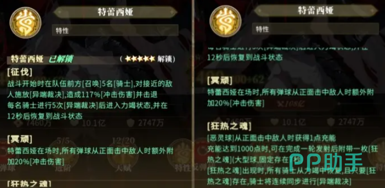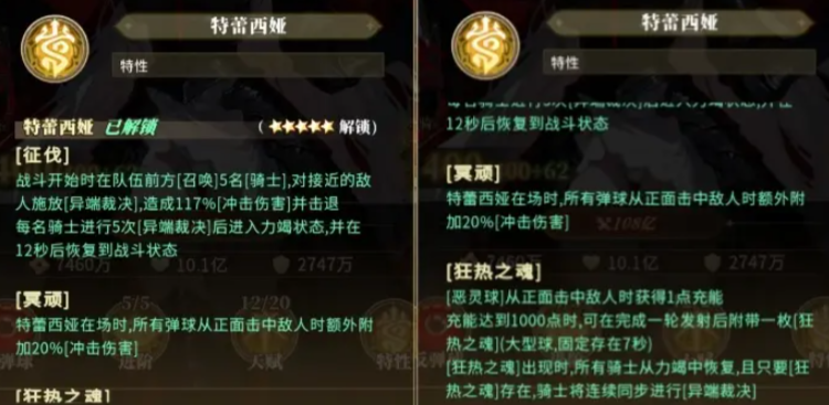 特蕾西娅的核心机制围绕“骑士征伐”与“充能协同”展开。战斗开始时,她将在队伍前排召唤5名骑士,对靠近的敌人发动“裁决”,每次造成117%冲击伤害;连续施放5次后进入12秒力竭冷却。其被动“冥顽”可使所有弹球在正面命中敌人时,额外附加20%冲击伤害。