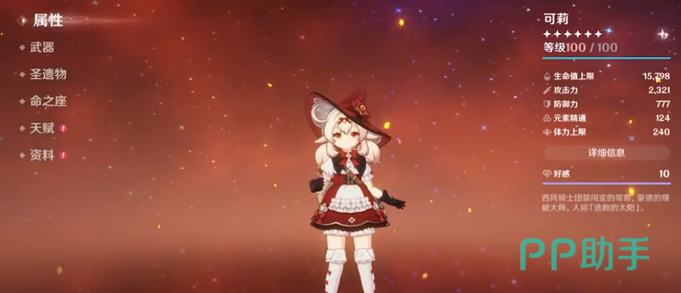 角色准备阶段需确保可莉达到100级,并激活第一命之座。武器推荐使用四星限定武器「嘟嘟可故事集」,兼顾元素反应适配性与技能倍率加成。属性要求为:攻击力2300、元素精通120、暴击伤害150%、暴击率39%。该面板在保证火系蒸发与融化反应稳定性的同时,亦能支撑中后期高密度敌群的快速清场需求。