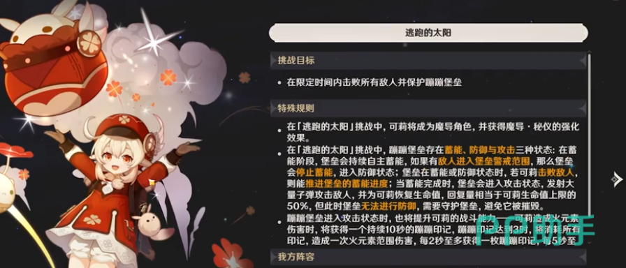 关卡核心机制包含两个重点:其一为中央充能堡垒——通过持续击败敌人积累能量,满格后自动为可莉恢复50%生命值,构成全程续航基础;其二为红圈禁入区域——所有输出行为必须在红圈边界外完成,一旦怪物跨入即判定失败。因此,战斗中需主动控怪位移,优先使用重击或元素战技将敌人推离危险区,再衔接爆发输出。