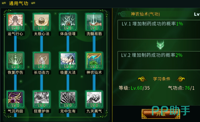 运气行心:这是一个值得加点的功法,可以提升玩家的生命力,提高生存的能力,可以保证在战场中的实力,一旦在获得生命加成之后,还能够拥有较好出色的容错率。