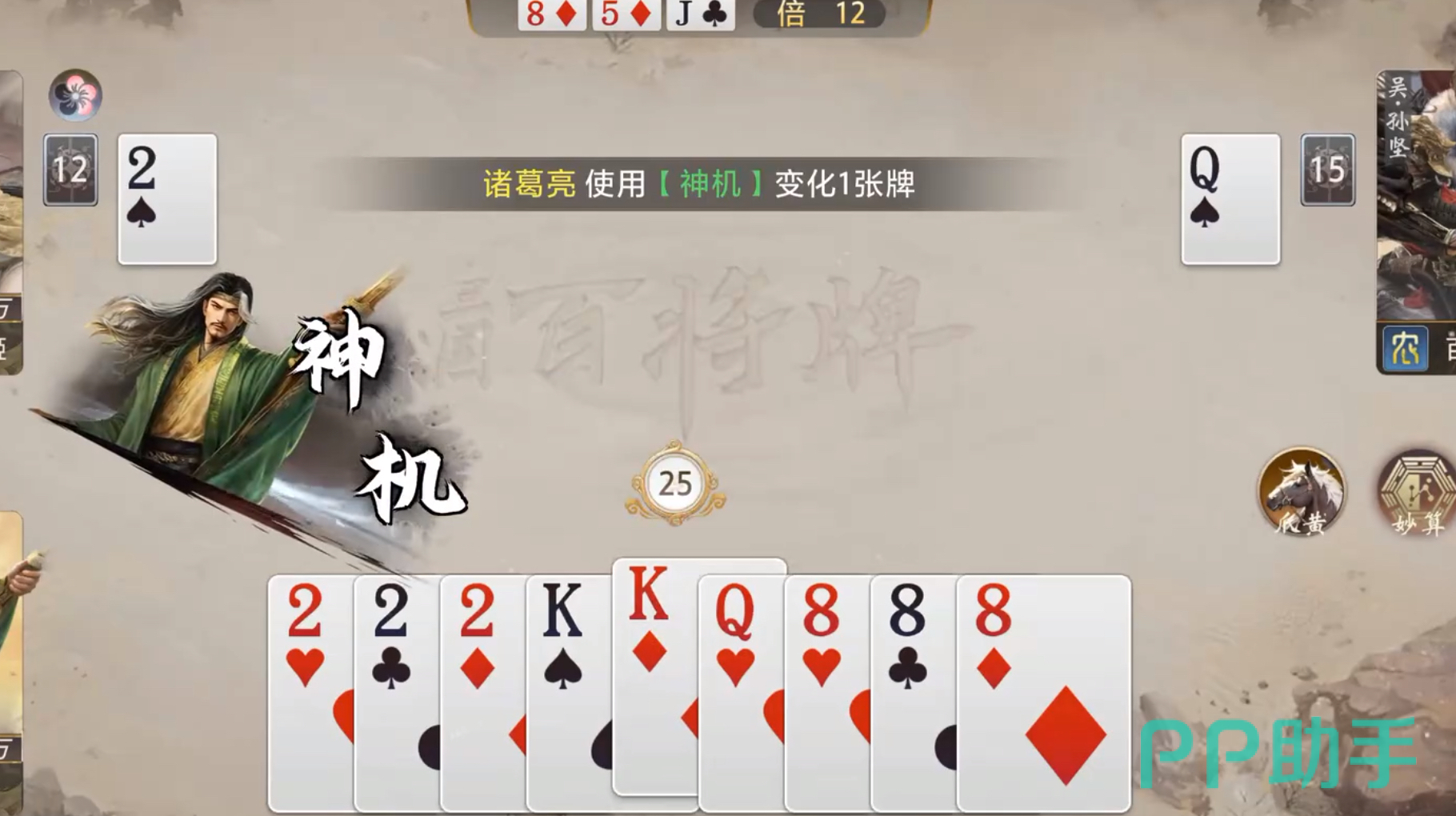 赵云作为T0级泛用型武将,以高操作自由度见长:可通过弃置对子或单牌换取万能牌使用权,单局最多弃置7张手牌,灵活适配多种控场与爆发场景。军师诸葛亮则提供双重战略支持——“妙算”技能允许其在叫分阶段预览底牌,构建先手优势;“神机”技能可将点数大于K的单张牌,自动转化为当前手牌中数量最多的牌型(如对子、顺子等),属典型策略向技能,需结合手牌结构与局势节奏审慎释放。