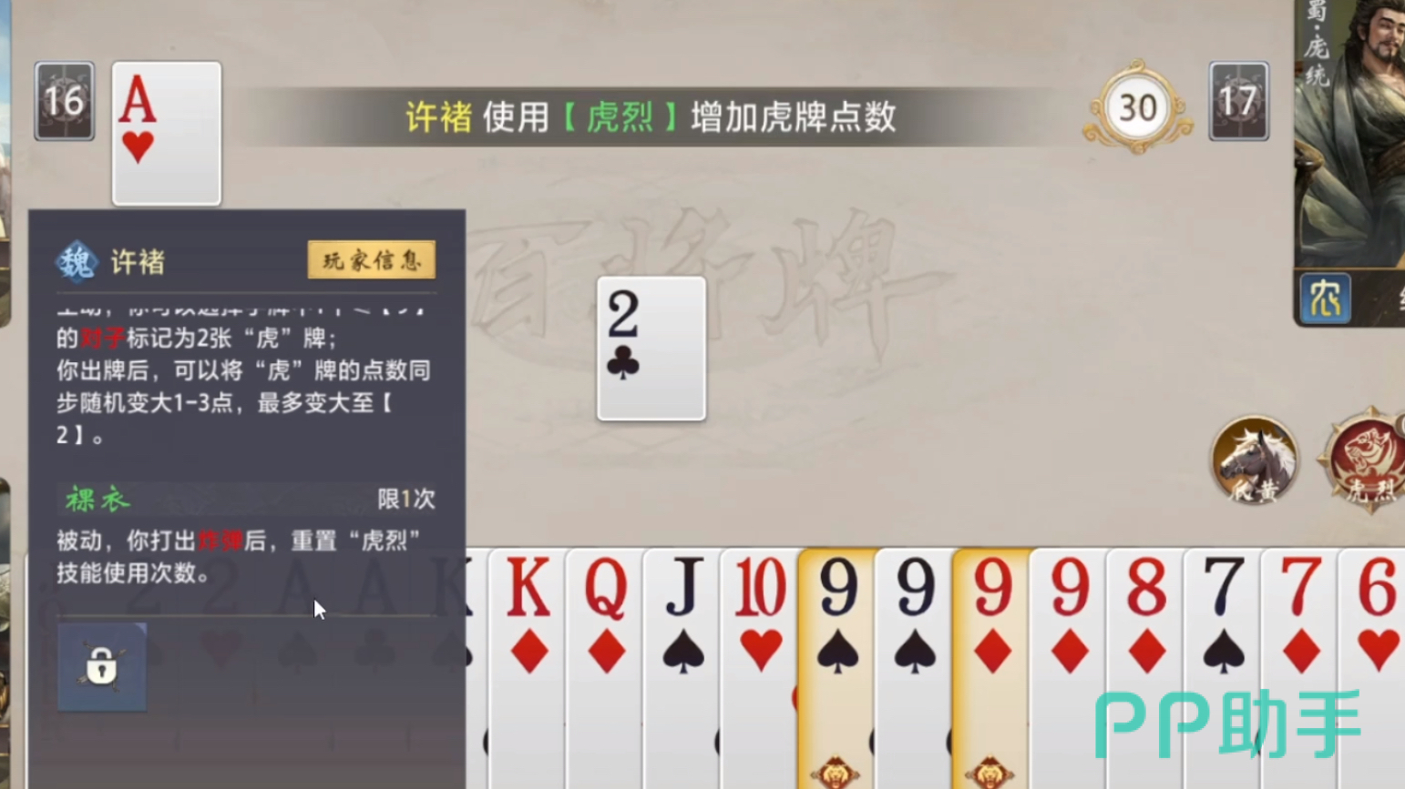 魏国阵营侧重协同控场与资源调度。“战神”吕布的“防反”机制依赖怒气积累——每回合获得怒气,累计达6点后可获取本局已打出的J、Q、K三张关键牌,但存在被对手干扰导致怒气不足而无法启动的风险。郭嘉的“遗计”可完整复制上家所出牌型,若与曹操的增伤效果联动,即可形成持续性输出循环。许褚则属于高波动型武将:可指定两张手牌为【虎牌】,其点数将随机提升1至3点,适用于低点数牌重组炸弹或顺子,实战容错率与上限并存。