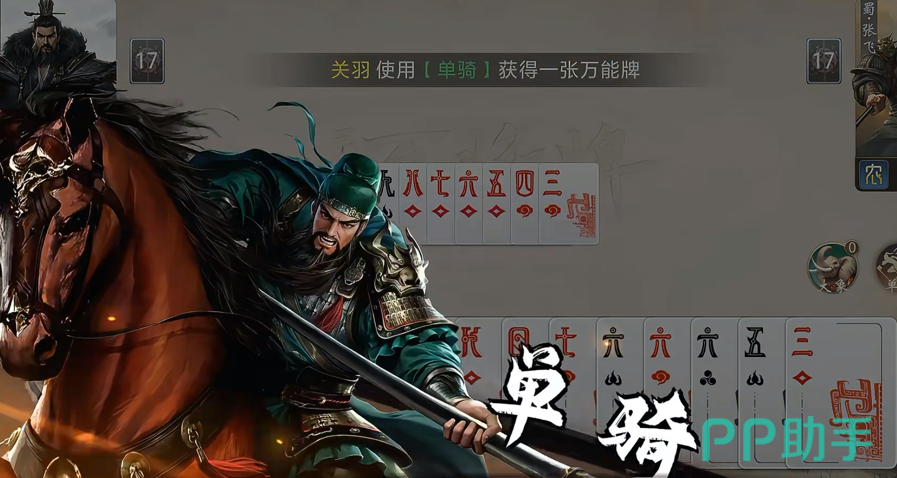 游戏中武将按势力划分为魏、蜀、吴及群雄四大阵营。本指南聚焦魏、蜀、吴三大主力阵营,逐一解析代表性武将的核心能力与实战适配逻辑。首先看蜀国阵营——整体风格强调节奏压制与主动进攻。代表人物关羽拥有双形态技能体系:“武圣”可在对手打出顺子时,随机抽取其一张手牌,实现资源截断与信息干扰;“单骑”状态下,使用顺子后可获得一张万能牌,若配合赤兔马,则触发四联顺特殊效果,大幅提升出牌连贯性与压制强度。