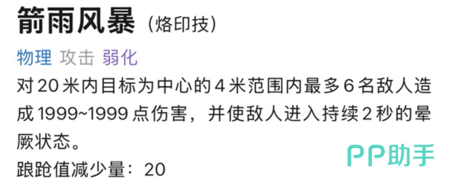 箭雨风暴是弓星少有的大范围群体控制技能,能够在以20米内目标为中心、半径4米的区域内,对最多6名敌人造成1999点物理伤害,并附加2秒晕厥效果。无论是面对密集小怪还是敌方集结队伍,此技能都能迅速打开局势,极大提升清场效率。