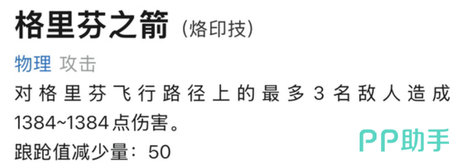 格里芬之箭是一项强力的直线穿透型烙印技能,能够对飞行路径上的敌人造成高达1384点的物理伤害,最多影响3个目标。此外,该技能还能削减目标50点踉跄值,有效打断敌方施法节奏,为团队创造进攻窗口。