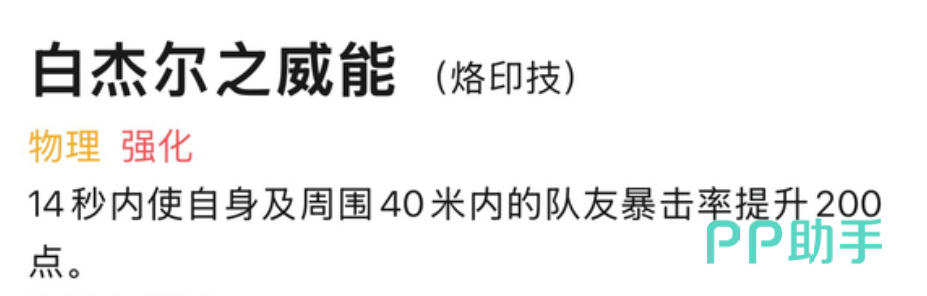 白杰尔之威能是一项团队增益型物理技能,施放后可在14秒内提升自身及周围40米范围内最多4名队友200点暴击率。这一技能显著增强了团队整体输出能力,尤其在副本攻坚或大型团战中具有不可替代的战略地位。