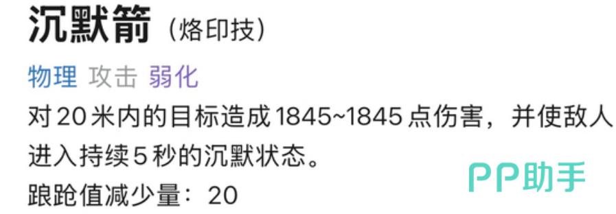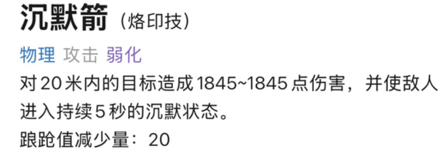 沉默箭专精于单体压制,可对20米内的单一目标造成1845点高额物理伤害,同时使其陷入长达5秒的沉默状态,期间无法释放任何技能。配合减少20点踉跄值的效果,该技能常用于限制敌方法师或治疗者的关键操作,是PVP中的核心控场手段之一。
