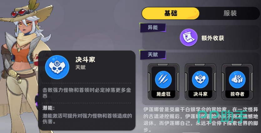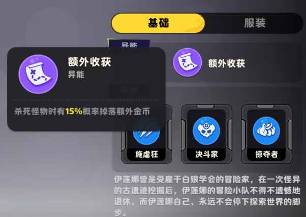 需特别注意:伊莲娜经历了多次平衡性调整,当前版本与其初始设计存在显著差异。现阶段她的异能触发高度依赖外部条件——即通过击杀敌人获取额外资源来激活后续能力链。具体而言,每次击杀怪物时,她有15%概率额外掉落金币,该机制直接强化了中后期的资源循环效率,为武器合成、商店刷新及多流派适配提供稳定经济支撑。