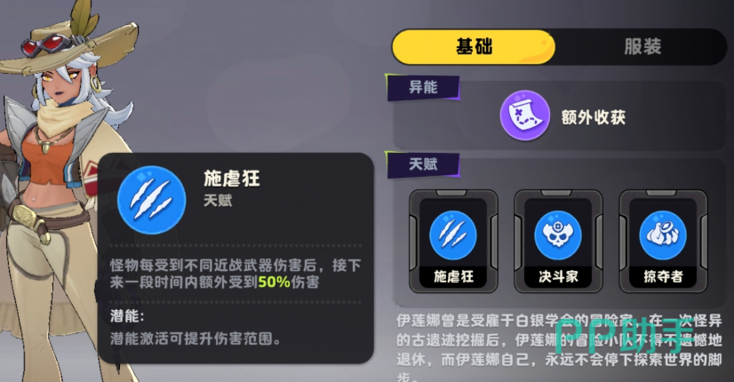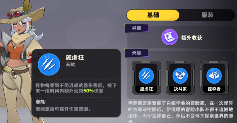 前期推荐天赋为【施虐狂】:当使用任意近战武器造成伤害后,伊莲娜将在接下来一段时间内获得50%的伤害加成。该效果可叠加至多个近战武器类型,且每新增一种近战武器即可提升整体增益幅度。因此,前期进化策略应优先追求武器种类数量而非单一品质——即便低星近战武器,只要类型不同,即可有效堆叠伤害增幅。相较之下,单纯依赖高阶武器合成带来的数值提升往往难以达到50%这一阈值,故本天赋的实际收益远高于常规养成路径。