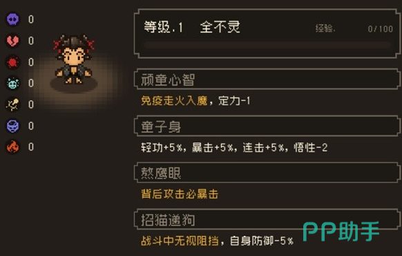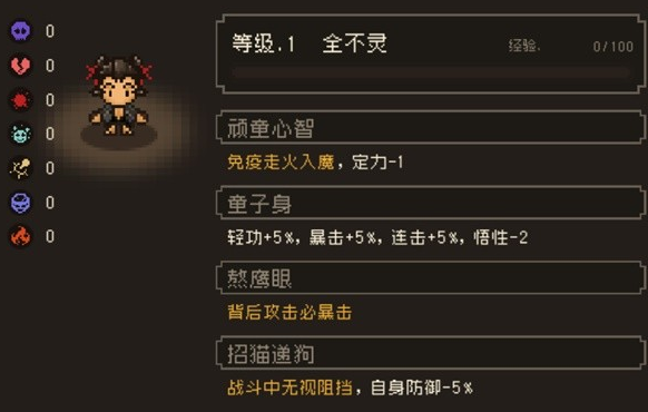 全不灵的根骨、身法以及悟性不错,因此所拥有的技能也会比较多,邀请入队后可以让主角学会江湖飘酒艺指法,其绝技是真踩脚指,伤害很高而且CD时间短,在面对单体敌人时作用非常不错,因此建议及早学习。由于本身就是个孩子,因此属性具有顽童心智,学习东西很快可以免疫走火入魔,但容易分心,所以定力会减少,而童子身的特点可以具有轻功、暴击、连击等输出能力的增强,身法灵活,拥有熬鹰眼后在背后攻击必定会产生暴击,同时还会拥有招猫递狗的特性,无视阻挡更适合切到对方关键角色打出高额输出。