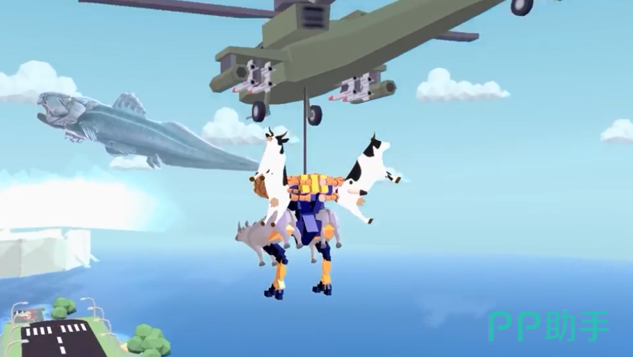 在开局之后,玩家们可以直接领取到一头黑牛,然后在前往左边的海域,在这里有一个小岛,上面放着一个机关,小伙伴们踩下这个机关就可以看到有一个直升机出现在了玩家的头顶,并且空投一个合体金刚鹿给大家。这个合体金刚露是可以当成坐骑来使用的,在后面迎战boss的时候也能够成为玩家们的助力。另外游戏里的武器可以重叠,所以大家可以先到仓库里面去多拿几把冲锋枪。