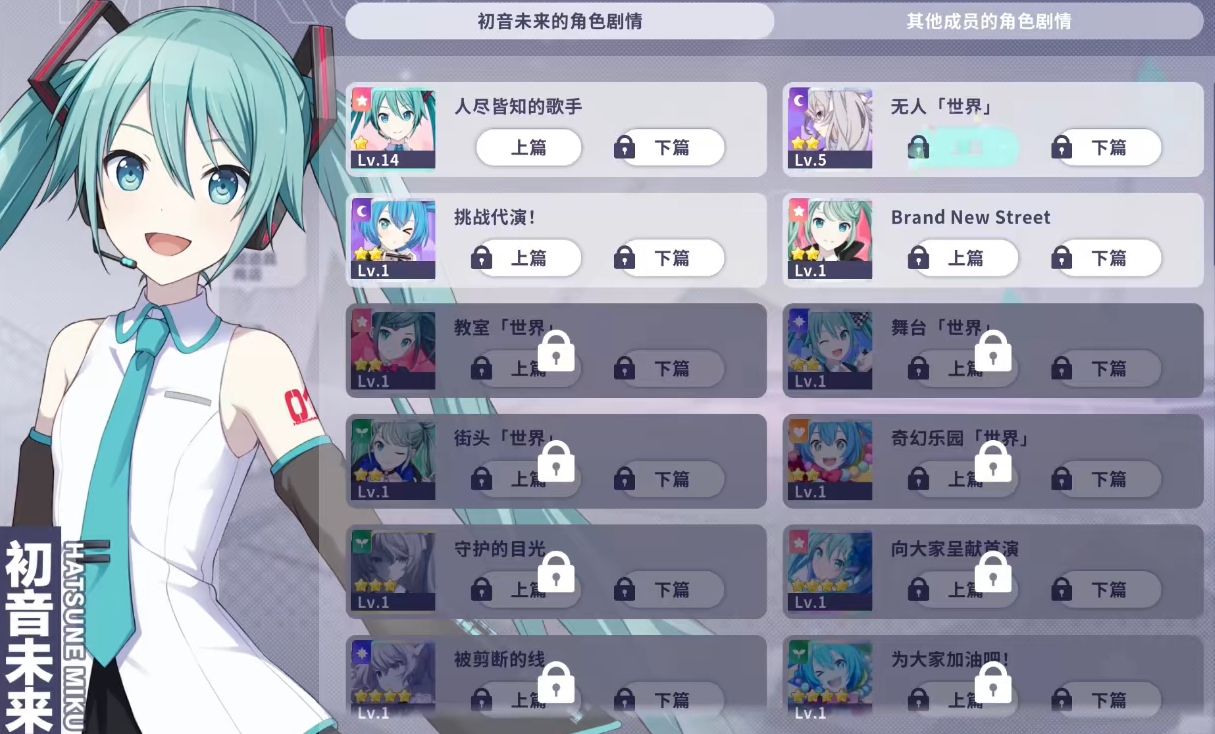 游戏中的角色都能通过主线来完成获取,初音未来自然也不例外,但要注意游戏的设计是每位角色都有一至四星的不同成员卡,玩家们通过主线获得的初音未来只是一星卡,而要详拿到初音未来其它星级的成员卡,玩家们还得通过活动奖励和招募这两种途径。