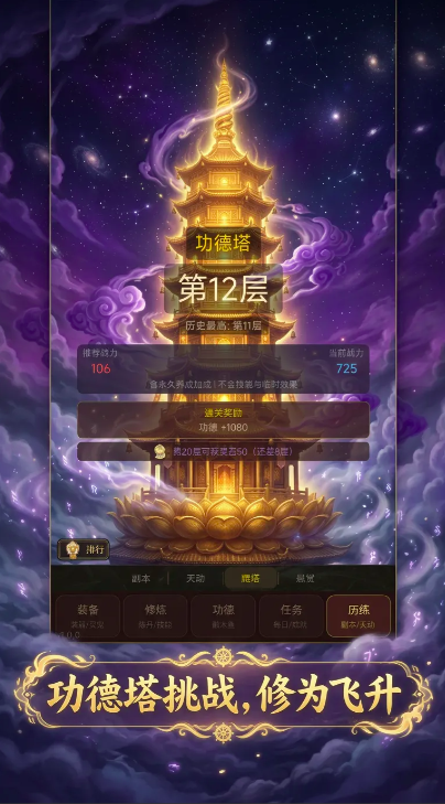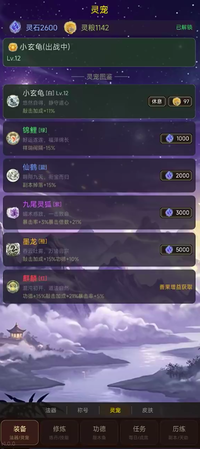 “功德塔”挑战模式进一步丰富了成长维度,助力玩家高效达成飞升目标。游戏深度优化离线机制——即使退出应用,功德值仍可持续累积;日常任务周期清晰、奖励明确,资源获取路径直观高效。宠物系统共设六类高品质灵宠,包括锦鲤、九尾灵狐等经典形象,支持自由选择与定向培养,增强修仙旅程的陪伴感与策略性。