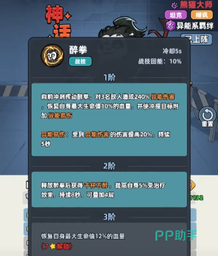 另一核心技能“醉拳”具备范围打击与自我续航双重特性:可同时攻击3名敌人,造成最高达240%攻击力的异能伤害;命中时额外恢复自身10%最大生命值;并有20%概率为目标施加“易伤”状态(受击伤害提高),该状态极易引发敌方集火,从而为我方创造关键的集火窗口,特别适配异能队或高频率AOE阵容。