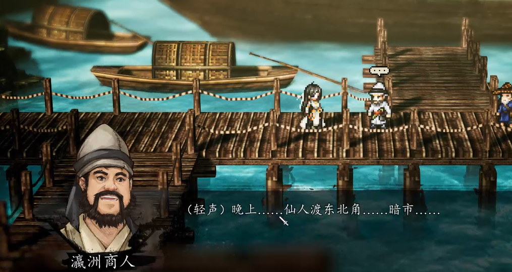 核心前置条件在于与瀛洲商人完成对话——此为后续所有事件的唯一触发点。与其交谈后,系统将提示前往仙人渡客栈寻找宋掌柜。完成对话后,场景即时切换至夜间模式,地图右上角将显现一座独立小屋。进入后即可遇见暗市商人,其对话具有唯一性,所售秘籍(如《玄阴掌》《流云步》等)均存在替代获取路径,非必购内容。