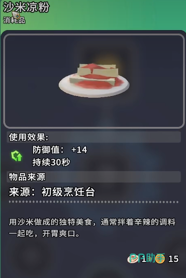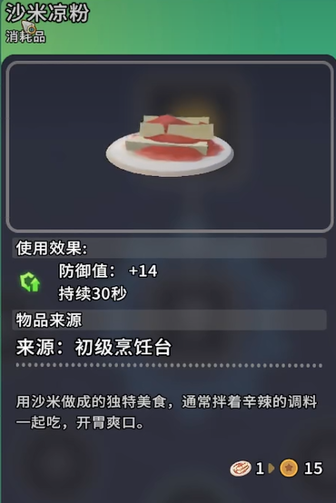 成品食用后可为角色提供即时防御加成:+14点防御值,持续时长严格限定为30秒。该效果属于临时性战斗辅助类增益,不可叠加,但可重复触发。在遭遇高威胁敌人、穿越毒雾区或挑战限时Boss等需要短时生存强化的节点中,沙米凉粉具备明确战术价值。