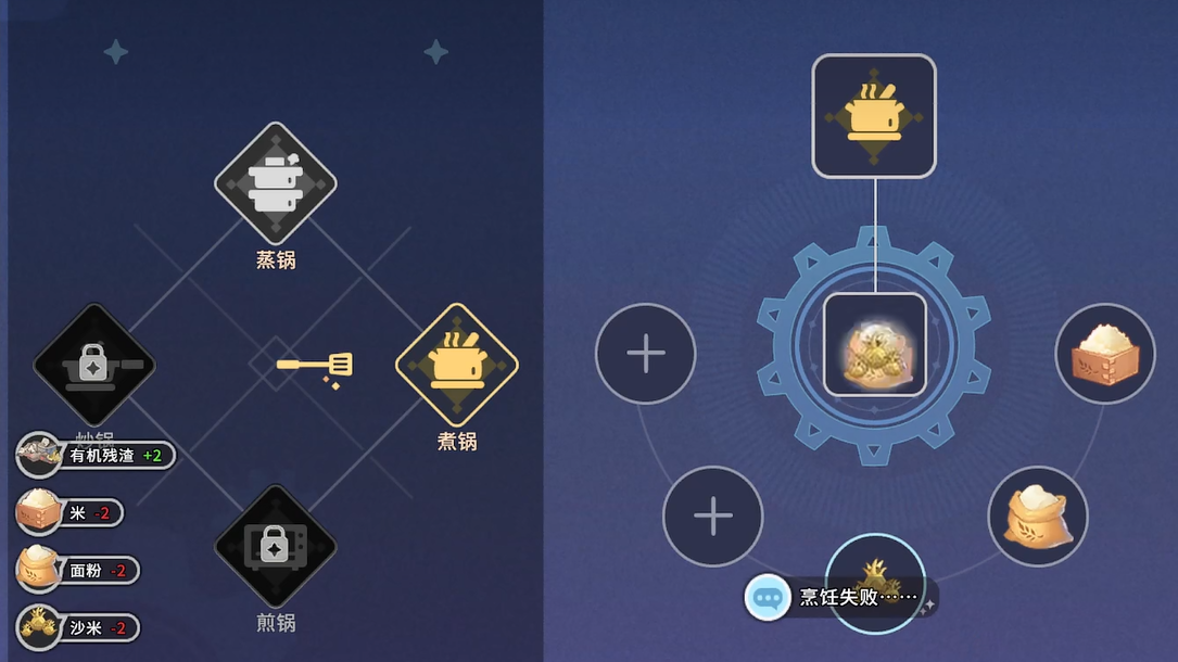 制作流程需依托特定设施:必须在已建造并解锁的“初级烹饪台”上,选择“煮锅”烹饪方式方可启动。若尚未完成烹饪台建造任务,或未习得“炖煮”技能分支,则即便集齐全部材料也无法进行合成操作。该限制强调了游戏内设施升级与技能树推进的协同关系。