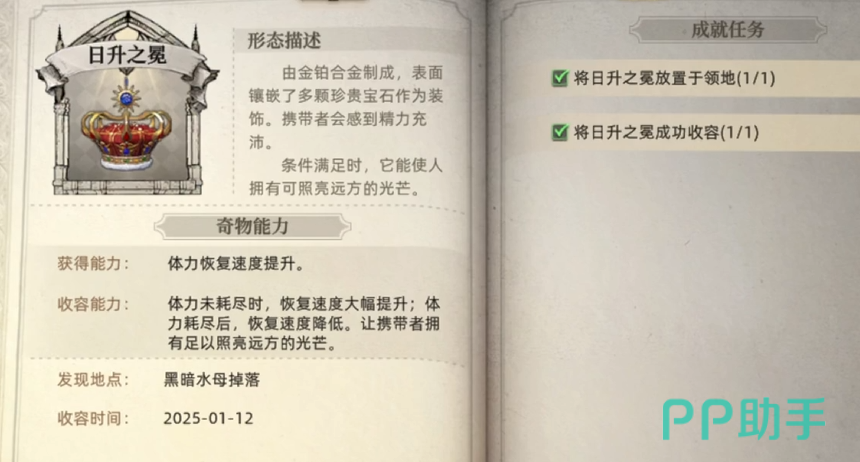 在击败黑暗水母之后,可获得道具日升之冕。道具可使玩家们获得相对应的成就,并获得一些特殊能力,首先就是当你的体力并未耗尽的时候,恢复的速度将会得到大幅度的提升,其次就是当你携带这顶冠冕的时候,可以永久性地驱除黑暗。在游戏中,如果玩家们前往一些比较黑暗的地方,那么这顶冠冕是非常好用的道具。