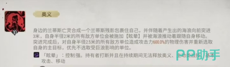 玛伊雅弥立约的奥义技能使用的时候,她身边的亡灵会合成一个兰蒂斯残影,紧密地包裹着自身,随后她会向前突进,这一过程中自身范围内的所有敌方单位都会被眩晕,陷入短暂的失控状态,然后在海浪的推动下,这些敌方单位会跟随她移动,突进完成之后,她还会再次造成一次物理伤害,并重新选择自身的主目标,而且她的奥义技能伤害范围较大,且具有强制效果,在奥义释放途径完成后,每个亡灵还会驱散奥义命中的敌方单位身上的一个增益效果。