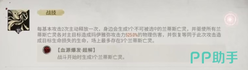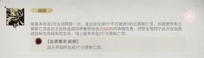 这些亡灵是来源于玛伊雅弥立约自身的战技,她在战斗中每进行两次基本攻击,就有机会主动释放这一特殊战技,一旦激活她身边会生成一个不可被选中的兰蒂斯亡灵,这些亡灵不仅能对主目标造成物理伤害,还能按照所造成的伤害血量来恢复玛伊雅弥立约自身的生命值,这种生命偷取效果也增强了她在战斗中的续航能力,同时场上最多存在三个兰蒂斯亡灵,这一限制使得大家需要根据实际情况灵活运用战技哦。