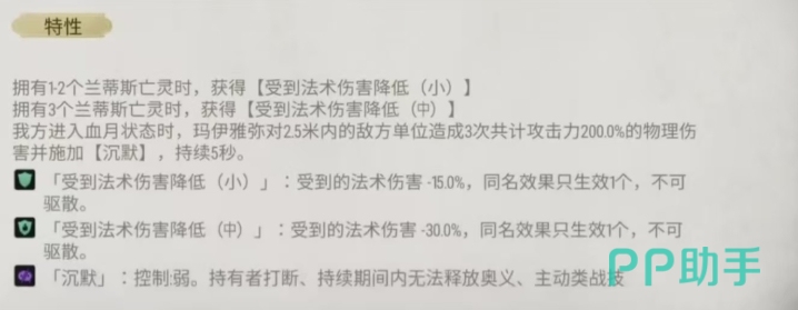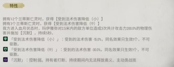 玛伊雅弥立约的基本攻击是能够对主目标造成总计188%攻击力的物理伤害,这样的伤害输出在基本攻击中是绝对不差的,其特性更是与兰蒂斯亡灵紧密相连,当拥有1-2个兰蒂斯亡灵时,她能获得受到小型法术伤害降低的效果,这在一定程度上提升了她在面对法术伤害时的生存能力,而当拥有三个兰蒂斯亡灵时,她所获得的中型受到法术伤害降低效果则更进一步增强了这种防御属性。