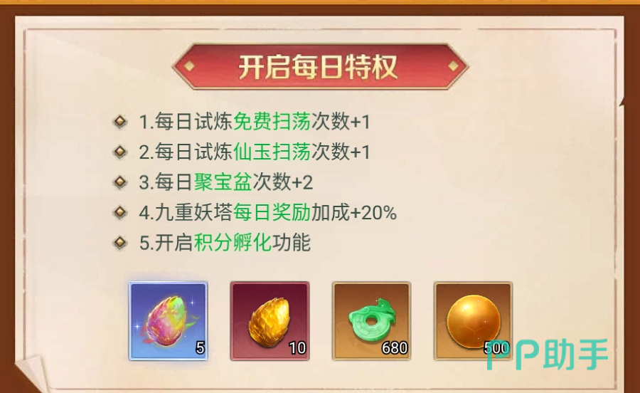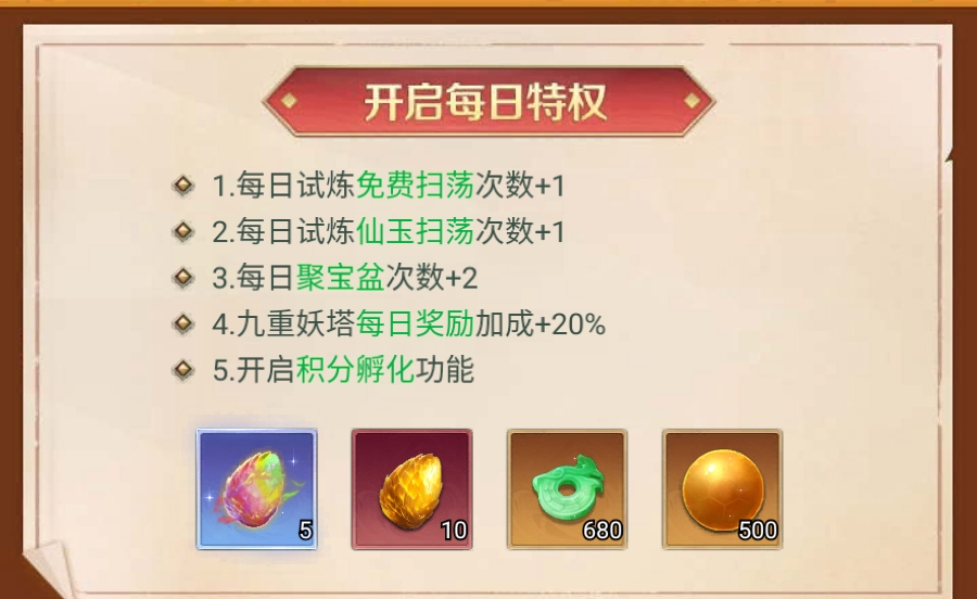 月投入≤30元 | ✓ | × | × | 30元【孵化超值礼包】和两种仙玉特权 | × |