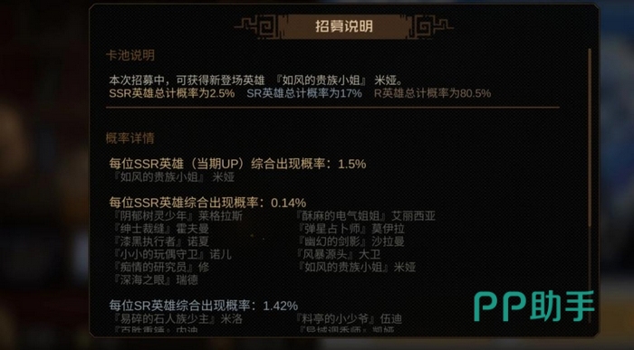 根据官方公布的卡池概率说明,SSR稀有度角色基础出率合计为2.5%,其中当期UP卡池中指定SSR角色的综合获取概率为1.5%;而单个SSR角色(含非UP常驻池)的独立出现概率稳定在0.14%。SR角色概率为17%,R级角色占比80.5%,三档稀有度构成完整掉落梯度。