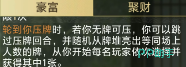 鲁肃的主要技能名为“豪富”,该技能在实战中具有较强的补牌能力。当玩家处于无法顺利出牌或手牌短缺的情况下,激活此技能可从牌堆中抽取一定数量的公共牌进行分配。在三人对局模式下,系统会亮出3张牌供所有玩家可见;而在五人局中,则会一次性展示5张牌,确保信息透明的同时提升策略博弈深度。