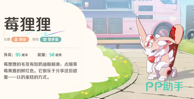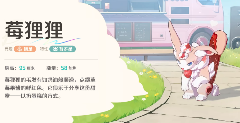 攻心蛊外形类似细长昆虫,配备一对显著触角,行为特征表现为持续关注心仪对象,并能手中凝聚跳动的心形能量体。该精灵归属于喜爱类别,战斗中可担当远程射手,其触角形状类似弓箭,具备一定战术价值。莓狸狸是一只外形萌态十足的狐狸精灵,毛发如奶油般柔顺,背部装饰有果酱纹理。虽仅有95cm身高,但能量达58,原理为饱足,职业设定为智多星,擅长策略辅助与技能调度。