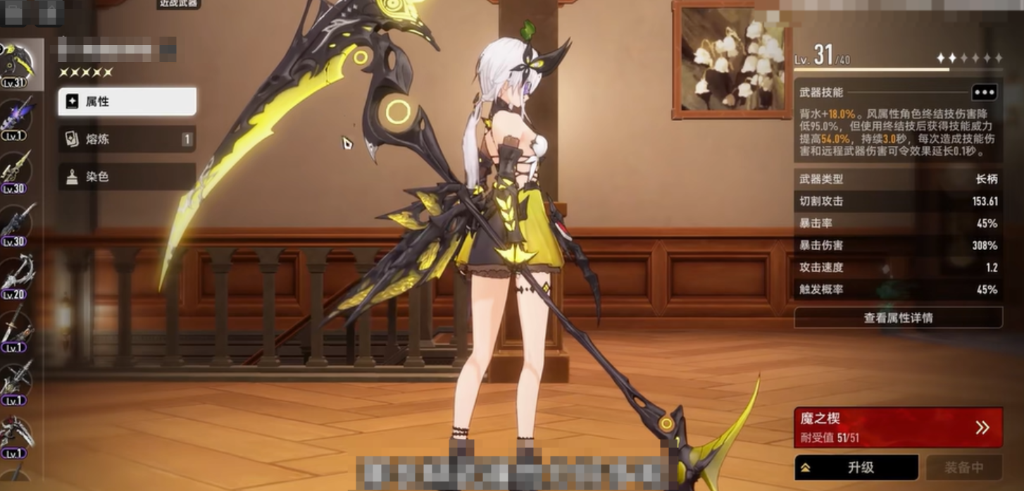作为近战武器中的高机动代表,绯切在空中作战方面表现出色,连招衔接顺畅自然,特别适合偏好灵活位移与空中压制的玩家使用。面对成群的小型敌人时,其大范围横扫技能可实现高效的群体清理,带来畅快的割草式战斗体验。该武器具备两大关键特性:一是“背水增益”,激活后可使角色的背水值提升15%,显著增强低血量状态下的持续作战能力;二是“终结技强化”,在释放终结技后,技能伤害提升45%,效果持续2.5秒,并可通过持续输出延长增益时间,非常适合打持久高压输出。
