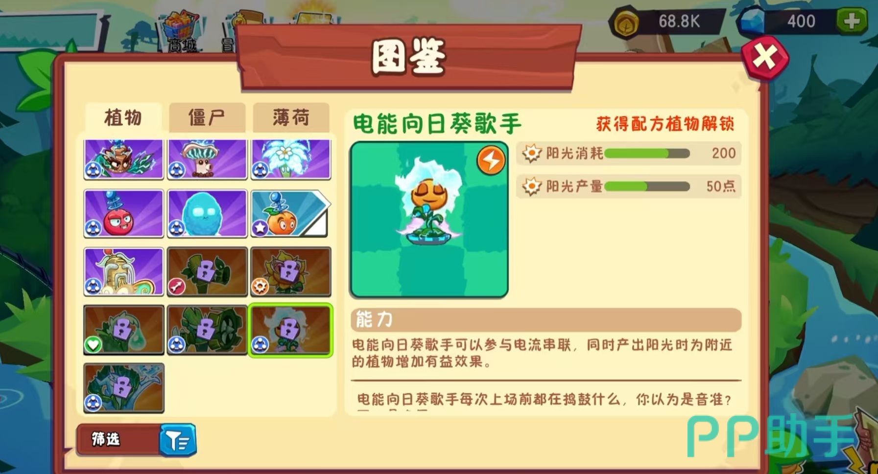 此外,向日葵歌手还具备极强的进阶潜力。例如,当其与脉冲黄桃融合后,可进化为电能向日葵歌手,技能效果升级为:以自身为原点,为3×3范围内的植物提供15%的攻击速度与攻击力加成。更重要的是,它能够激活电系植物之间的“电能串联”机制,使参与串联的电属性植物逐步提升电力等级。每一级电力等级均可提高普通攻击触发麻痹状态的概率,对于构建以控制为核心的电系阵容而言,向日葵歌手起到了不可或缺的关键作用。