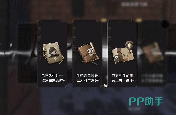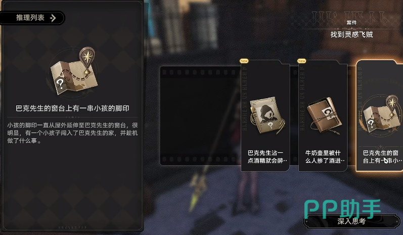 当玩家开启相关支线任务后,会进入一个以逻辑推导为核心的剧情环节——寻找所谓的“灵感飞贼”。案件背景是巴克先生的房间遭人闯入,而他本人也因酒精影响陷入昏迷。为揭开真相,玩家需先进入思考模式,在此界面中会出现四个可选线索。建议优先选择以下三项进行组合分析:第一,巴克先生对酒精极度敏感,哪怕少量摄入也会立即醉倒;第二,其房间内的牛奶壶被人偷偷混入了酒液;第三,窗台处留下了一串清晰的脚印,暗示入侵者曾由此进入。