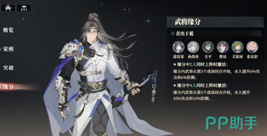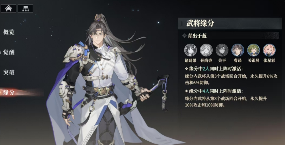 缘分内武将能够永久提升6%的攻击和6%的防御,这一效果同时又赋予了他们更加锋利的武器,使得他们在战斗的生存能力和输出能力都得到了强化,而当缘分中的任意4人同时上阵时,会有更为强大的效果将被唤醒,从第3个战场回合开始,缘分内武将能够永久提升10%的攻击和10%的防御,基于曹昂的这些特性和缘分体系,大家在配队时便有了更多的选择空间。