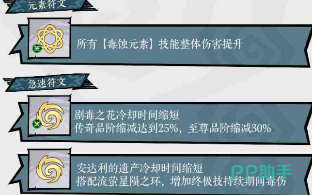 技能与符文配置是本BD输出成型的关键。英雄符文优先选用卡兹与菲奥娜,二者均提供毒元素伤害加成。符文加点策略为:元素类符文主堆伤害增益,急速类符文必须点满;再搭配“毒云蔓延”强化符文与“剧毒散射”特效符文,可使毒素扩散范围与单次触发伤害同步提升,综合输出能力实现翻倍跃升。技能链以“剧毒之花”为威能核心,辅以“毒云蔓延”扩大初始覆盖,“剧毒散”强化多目标溅射,三层技能联动后,中毒层数迅速叠加,后续伤害呈指数级增长。