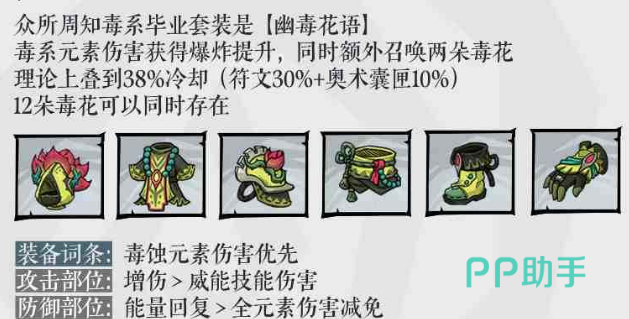 本流派的核心机制在于中毒层数的快速叠加与长效维持:每层中毒独立存在4秒,配合高冷却缩减可实现毒花无缝刷新。实战中,场上毒花数量直接决定DPS上限。毕业配装首选专属套装“幽毒花语”,该套装不仅提升毒系元素伤害,还可额外召唤2朵毒花。在符文提供30%冷却缩减、奥术囊甲提供10%冷却缩减的前提下,当总冷却缩减叠至38%时,最多可同时存在12朵毒花,形成密集毒素覆盖区,对群怪与精英单位均具备极强压制力。需注意的是,安达利遗产效果需与该BD严格适配,否则将影响整体循环效率。