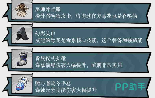 前期过渡阶段无需强求毕业装。推荐使用巫师外形服提升召唤物基础攻击;幻影头巾强化核心威能技能“剧毒之花”的生效质量;赠予者暖冬手套进一步提高技能伤害;三者搭配贵族仪式长靴,可在中期地图清理中保持稳定节奏。武器方面,符文石板用于加快技能施放频率,巨人鞭子则压缩关键技能冷却时间,两者协同优化循环流畅度。