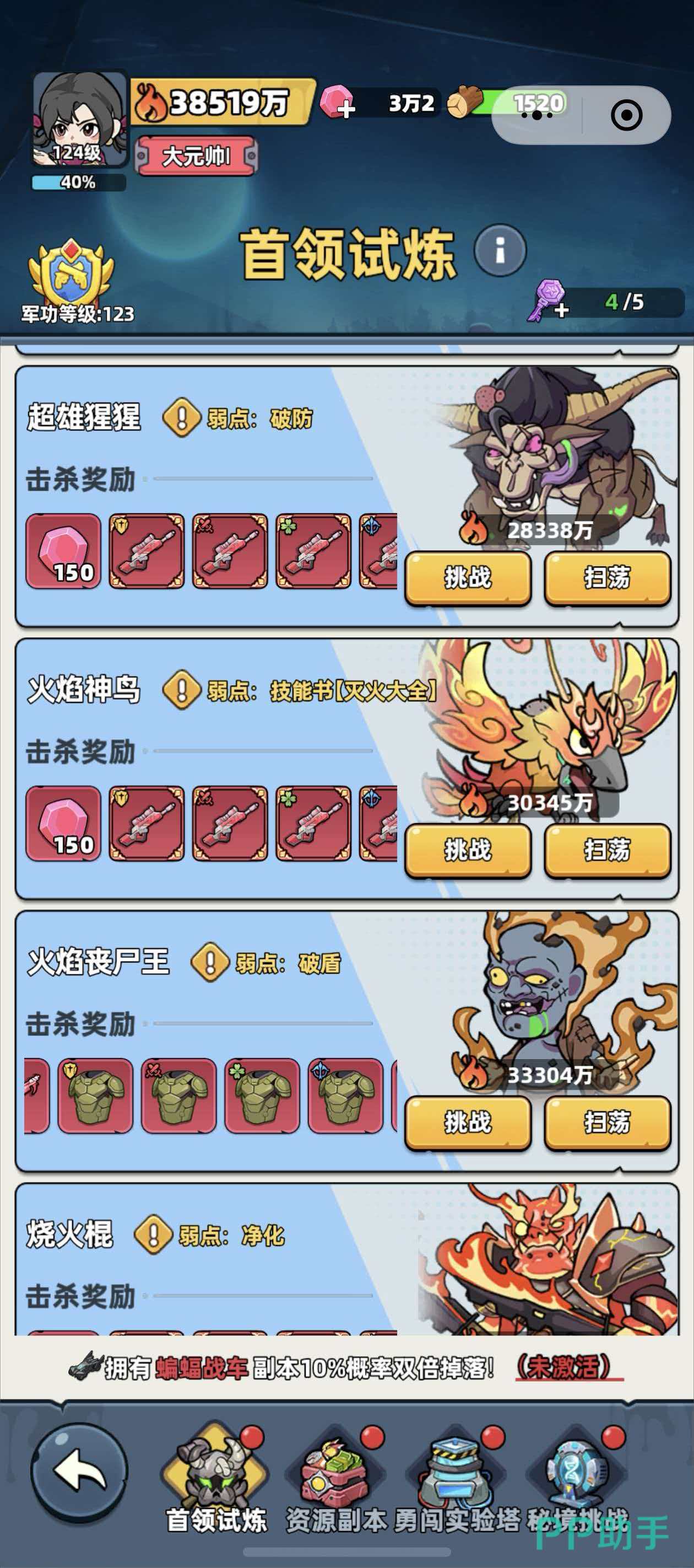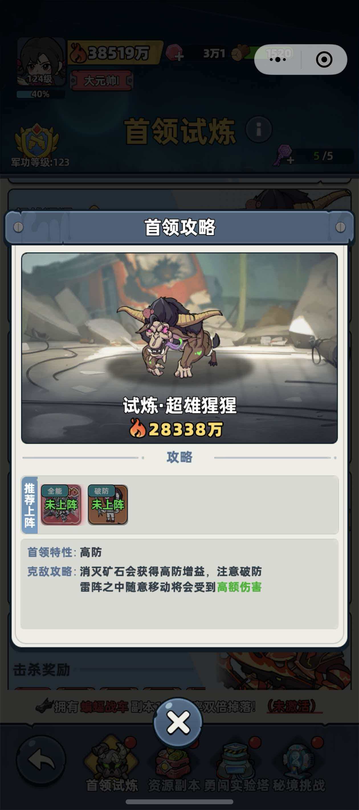 超雄猩猩并非传统意义上的类人猿形态Boss,而是以牛型躯干、双生巨角与外露獠牙构成的压迫性视觉设计,整体风格偏向暗黑系重型魔物。其基础战力数值锁定为28338万,属于挑战大厅中梯队靠前的硬核关卡。系统明确提示:仅当玩家队伍总战力达到或超过该数值时发起挑战,方可保障基本通关可行性;战力明显不足时强行进攻,将大概率触发快速减员机制。