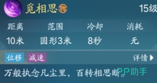 技能“觅相思”可在指定方向投掷刃轮,对路径上的敌人造成伤害并附加减速效果,刃轮可持续存在3秒。若再次激活该技能,角色将瞬移至刃轮所在位置,对沿途目标造成伤害,并获得1层“刃”。此技能兼具追击、逃生与资源获取功能,是合欢机动性的重要保障。