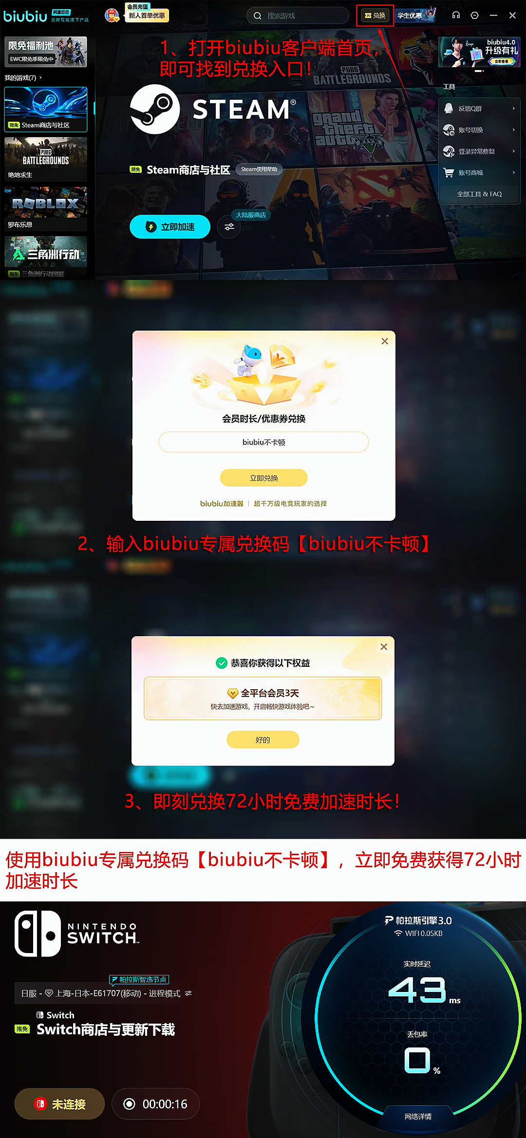 同时新用户注册即可免费开启24小时全游戏加速,全体用户兑换口令【biubiu不卡顿】可额外增加3天加速时长,其中新用户还能再叠加96小时免费加速,让你零成本体验极致流畅。