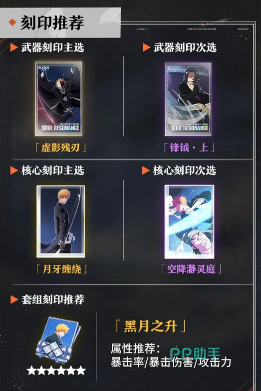 为提升黑崎一护的整体输出能力,刻印搭配需精心规划。武器刻印推荐选择“月牙缠绕”,配合“空降瀞灵庭”使用,能够显著增强核心技能的伤害效果。核心刻印方面,“虚影残刃”应优先考虑,有助于提高战技的上限输出。若采用套装组合,则建议锁定“黑月上升”以获得最佳增益。在阵容构建上,基础搭配可选用能快速提升暴击率的辅助角色,从而最大化输出效率。
