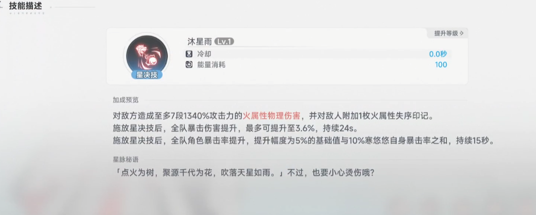 她的终极技能拥有7段高倍率火属性物理伤害,并为敌人附加一层“火属性失序”状态。释放大招后,全队暴击伤害提升,持续24秒;同时队伍成员获得暴击率增益,提升数值为5%基础值加上寒悠悠自身暴击率的10%,持续15秒。