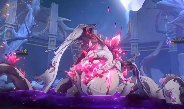 随着全新剧情的推进与场景的拓展,一系列新的敌人也随之登场,死龙残躯玻吕刻斯就是一个强大的新BOSS,玻吕刻斯被称为死龙,是3.2版本中极具压迫感的强大BOSS,它周身散发着死亡与腐朽的气息,巨大的身躯仿佛由破碎的龙骨与涌动的黑暗能量构成,双翼展开时遮天蔽日,每一次挥动都伴随着强大的能量波动,玻吕刻斯在战斗中会对己方造成衰亡伤害,这是一种极为特殊的伤害类型,它具有无视护盾、防御的特性,而且无法被分摊,这意味着常规的防御手段在它面前效果大打折扣,当己方角色生命值降低时,玻吕刻斯会积累濒死梦泡,并进入强化状态,进入强化状态后的死龙,将展现出超强的群伤能力,其攻击范围覆盖全场,伤害量足以将全员打残至丝血,对玩家队伍的生存能力构成巨大威胁。