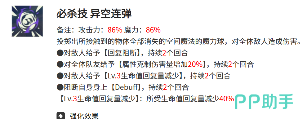 兰吉尔斯的必杀技名为“异空连弹”,攻击力与魔力消耗均为86%。施放后,他会投掷出能够湮灭一切接触物体的空间魔力球,命中敌人后附加回复阻断及生命回复减少效果,有效压制对手续航能力。同时,该技能还能为全体我方单位提供属性克制伤害提升20%的增益,并且最关键的是,可立即清除自身所受的所有Debuff状态,极大增强了战场生存与持续输出能力。