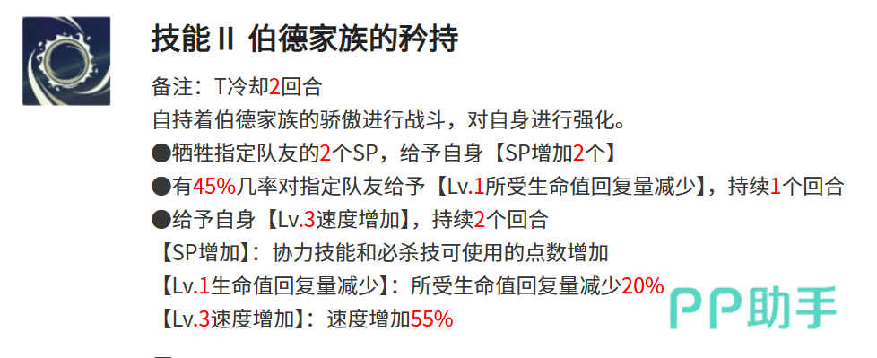 另一项主动技“伯德家族的矜持”则展现了兰吉尔斯作为贵族战士的战术风格。释放此技能时,他能够牺牲两名队友的SP点数,并将其转移至自身使用,同时自身获得速度提升效果,增强出手优先级。此外,该技能还有45%几率使被牺牲的队友陷入所受治疗效果降低的状态,属于高风险高回报的战略性技能,适合在关键回合集中资源爆发。