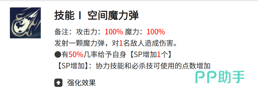 兰吉尔斯拥有四项核心技能,包含两个主动技、一个必杀技以及两项被动增益效果。其主动技能之一“空间魔力弹”是一项单体高伤技能,攻击力和魔力消耗均为100%,可对敌方单一目标造成大量伤害。命中后有50%概率为自己额外获得1点SP值,该机制有助于加快协力技与必杀技的能量积累,在持续作战中具有显著优势。