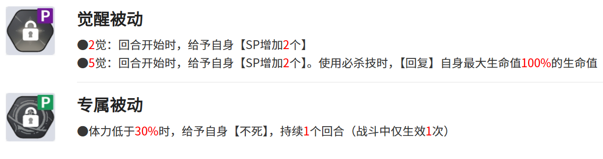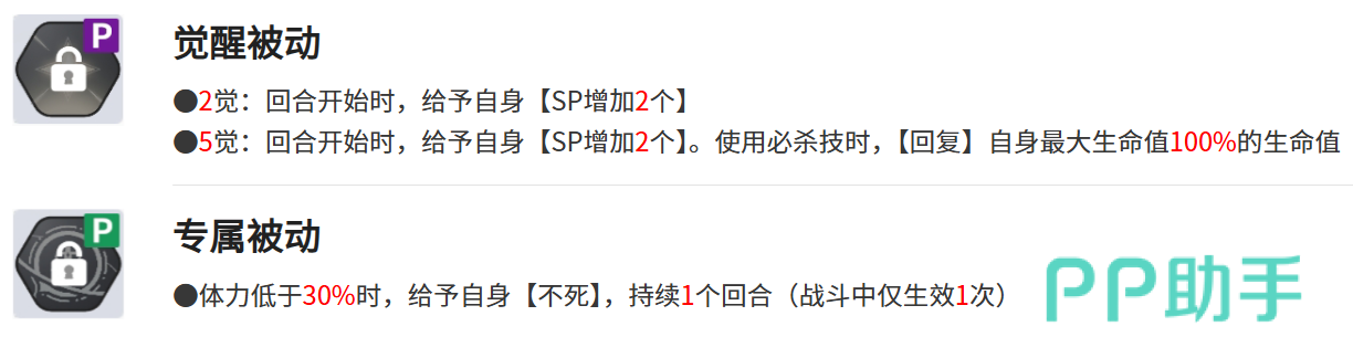 在被动技能方面,兰吉尔斯的觉醒被动分为二觉与五觉阶段。二觉时可直接获得2点SP加成,大幅缩短技能循环周期;五觉状态下,除继续享受2点SP增益外,每次释放必杀技后还能恢复自身最大生命值的100%,实现满血再战的强力效果。专属被动则设定在其生命值低于30%时触发,自动进入不死状态,进一步保障其在逆境中的存活率。