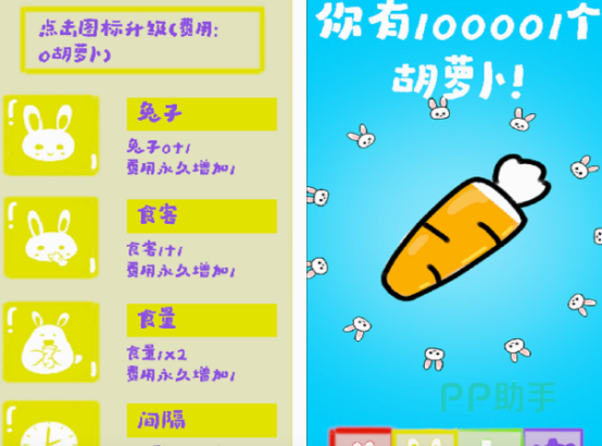 这款有可爱的小兔子,以及这种动物爱吃的胡萝卜进行设计,清晰的颜色,搭配上简单的玩法,都可以帮助大家,享受这款不需要联网就能体验的单机游戏,所具备的独特之处。需要在玩的过程中,通过不断点击萝卜,来拥有更多的萝卜。还能将自己所获得的萝卜通过升级以后,变成更厉害的,这样在兔子食量不断增加的情况下,也能满足小兔子的需求。