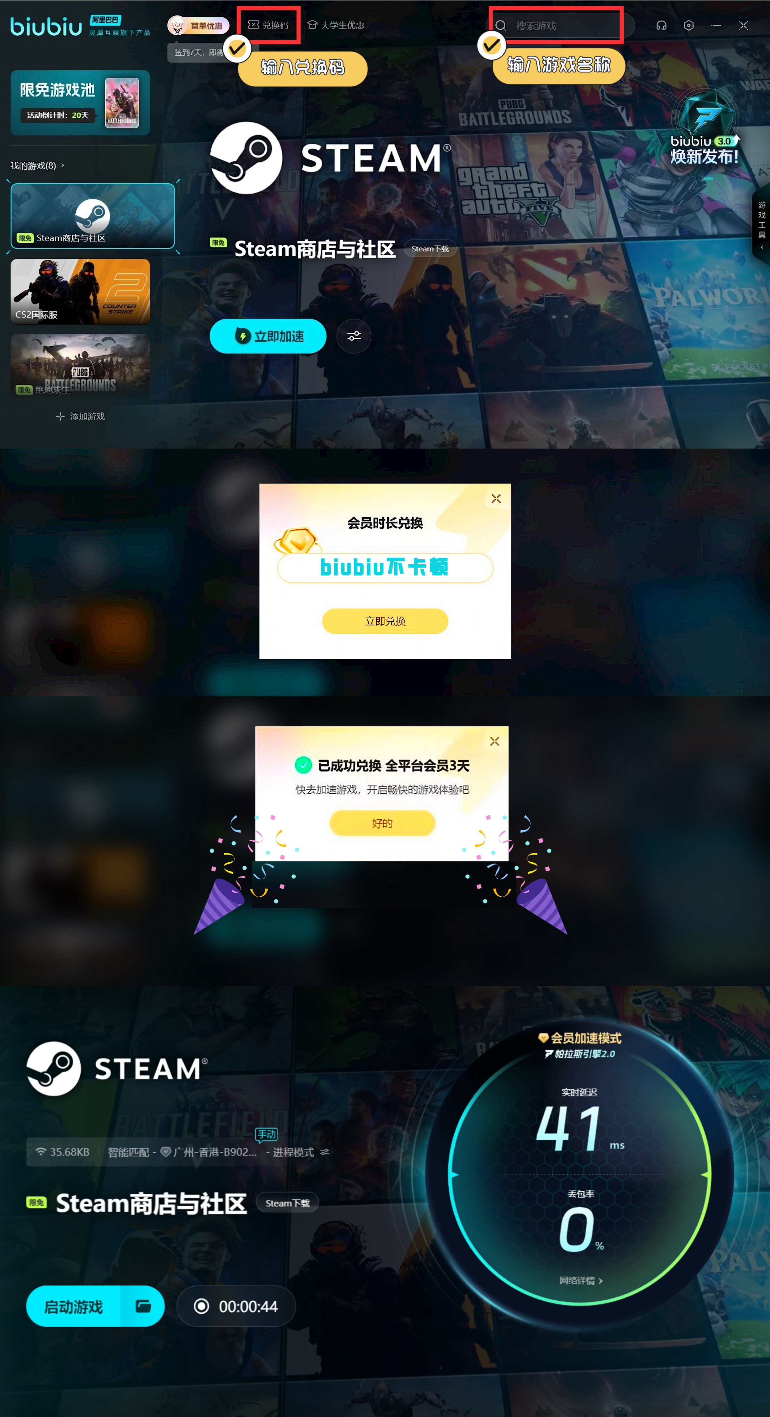 在加速器的选择上,主要是看哪个加速器的加速原理更高效和稳定,当然加速收费上也要尽可能的合理。对于biubiu而言,先不着急来进行充值,可以来加速器上领取一些免费的加速福利。新用户在注册并登陆后能直接获得3h的加速,用兑换口令“biubiu不卡顿”可以获得3天的加速。小编相信通过这些加速时间足够让小伙伴们深度体验到biubiu加速的高效稳定。